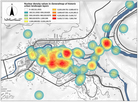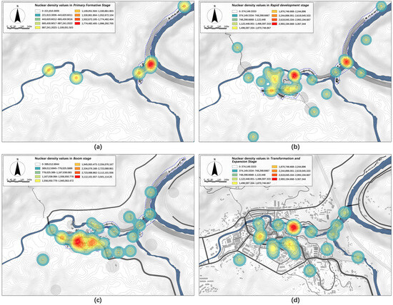 The overall spatial density of historical landmark nodes reflects the distribution of historical value richness during specific periods. Conzen’s concept of morphological regions is widely used to analyze historical value richness [61]; a higher number of landmark nodes within a region indicates greater historical value richness [62]. This study employed ArcGIS10.8 software’s spatial analysis capabilities to transform the distribution of landmark nodes across various historical periods into vector point data. Kernel density analysis was performed for each historical period to visualize changes in historical value richness (Figure 9).