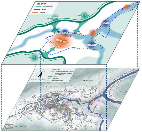 The historical landscape of Dongxi Ancient Town in its primary formative phase. (Source: Self-drawn by the author).