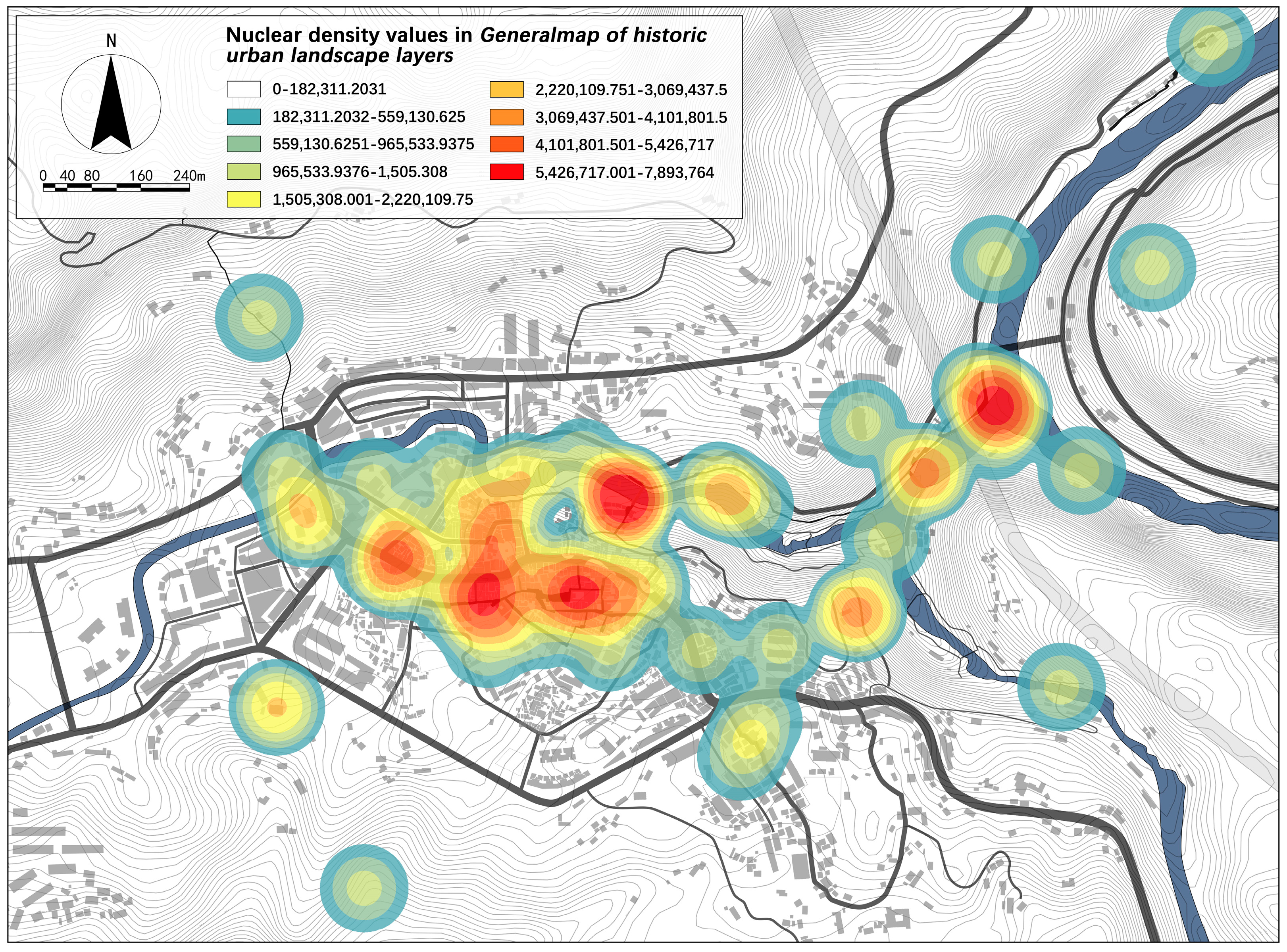 The ArcGIS method is the most basic approach for organizing data in layers. By layering geographical entity data and image decomposition, it builds spatial maps of data models [48]. In the analysis of value changes over time, ArcGIS’s spatial analysis tools transform the distribution of landmark nodes from different historical periods into vector point data, conduct kernel density analysis, and evaluate historical value richness and trends for each period. For current value assessment, the weighted sum tool is used to overlay historical value richness data across periods, resulting in a layered map of total historical value richness, highlighting areas with high historical value.