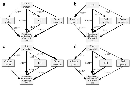 - The direct and indirect effects of the cultivated land environmental system on the sustainable utilization of cultivated land are analyzed using a structural equation model [42].