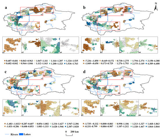 - The GWR model accounts for local effects influencing the sustainable utilization of cultivated land and exhibits greater accuracy than other models [37]. Consequently, this study utilized the GWR model to analyze the interactions between the cultivated land environmental system and the sustainable utilization of cultivated land across various spatial regions of the Tarim River Basin. The equation is as follows: