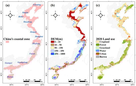 Considering that the delineation of a coastal zone lacks strict standards, and using the administrative region as the study area can facilitate the better application of the research results in local management, we select China’s major coastal cities as the CCZ (Figure 1a), which spans a latitude range from 18.16° N to 42.13° N and a longitude range from 109.48° E to 125.71° E. The CCZ traverses 11 provincial-level administrative regions from north to south in China and features 18,000 km of mainland coastline and 14,000 km of island coastline. We divide the CCZ into three segments: North CCZ (Liaoning, Hebei, Tianjin, and Shandong), East CCZ (Jiangsu, Shanghai, Zhejiang, and Fujian), and South CCZ (Guangdong, Guangxi, and Hainan). Due to inconsistencies in data, Taiwan, Hongkong, and Macao are excluded from this study. The total land area of the CCZ is approximately 489,900 km2, accounting for about 5.1% of China’s total land area. But it supports approximately 20% of China’s population and accounts for 40% of the national economic output []. The overall spatial pattern exhibits a lower elevation in the north and higher elevation in the south. The northern regions, such as Shandong and Jiangsu, are characterized by low-elevation plains primarily used for agriculture, while the northeastern and southern high-elevation hilly areas are predominantly covered by forests. Over the past 25 years, land use and land cover have continually changed, with the most notable trend being the ongoing expansion of urban construction land []. By 2020, urban land in the CCZ accounted for approximately 8.64% of its total area, while the proportion of cropland, forest, grassland, and water is 60.76%, 24.66%, 2.28%, and 3.56%, respectively.