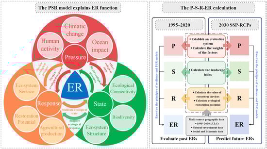 In this study, we propose an approach to represent ER in a more integral manner by defining it as the ability of coastal ecosystems to maintain normal function, or to dynamically adapt to achieve a balanced state in response to external or internal ecological pressures and disturbances. Unlike qualitative or quantitative studies focusing on specific disaster factors or sources of ecological stress, we emphasize the assessment and optimization of the overall system’s capacity to maintain dynamic balance amidst internal or external ecological pressures []. Building upon previous studies, we adopt the Pressure–State–Response (PSR) model [] to disaggregate ER of coastal zones into three dimensions: ecological pressure (P), ecological state (S), and ecological response (R) using the CCZ as illustrative areas, in which each dimension is used to calculate respective indices, ultimately culminating in the calculation of ER. The objectives are to (1) design an ER assessment method for coastal zones based on the PSR model, (2) analyze the spatial distribution patterns and temporal-spatial variation characteristics of ER from 1995 to 2020, (3) predict ER under five scenarios—SSP1-2.6, SSP2-4.5, SSP3-7.0, SSP4-3.4, and SSP5-8.5—for the year 2030, and (4) explore the optimal development pathways for the CCZ.