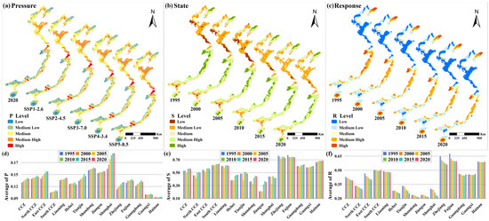 Spatial distribution of P, S, and R (a–c) and average of P, S, and R (d–f) from 1995 to 2020.