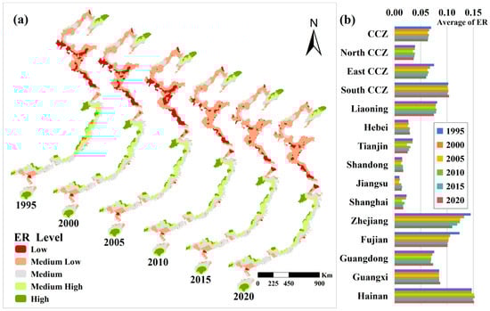 Spatial distribution of ER (a) and average of ER (b) from 1995 to 2020.