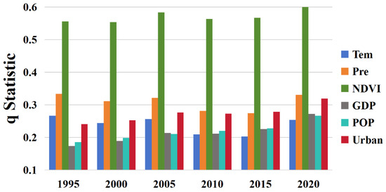 We select six representative factors—temperature, precipitation, NDVI, GDP, population, and urbanization—from natural environmental and socioeconomic aspects. The driving analysis using the GDM indicates that all six factors passed the significance tests (p < 0.05). As illustrated in Figure 6, the q of six factors were all higher than 0.1, demonstrating a significant driving effect on ER from 1995 to 2020. Among them, NDVI exhibited the highest q value, with a multi-year average of 0.5712, significantly higher than the other factors. Given that NDVI can be utilized to analyze and present the status of surface vegetation, higher NDVI values indicate healthier and denser vegetation in a region. This underscores the critical role of vegetation in maintaining the resilience functions of coastal ecosystems, reinforcing the fact that forests are important ecological land types.