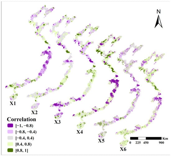 Spatial distribution of correlation coefficients between ER and driving factors: X1-temperature, X2-precipitation, X3-NDVI, X4-GDP, X5-population, and X6-urbanization.