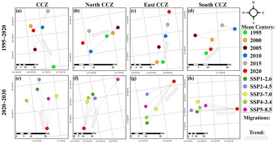 The migration of the mean center of ER plays a crucial role in understanding the changes in the spatial pattern of ER and its future trends. As illustrated in Figure 9, the spatial distribution of mean centers of ER in the CCZ ranges in latitude from 27.84° N to 28.53° N, in longitude from 116.79° E to 117.1° E, all located in the southeastern region of China. The spatial change trend of ER has shown a consistent northward shift over the past 25 years. For the predicted mean centers, all of them keep the same trend of a northward shift from 2020 to 2030. Therefore, the analysis indicates a significant northward trend of ER in the CCZ from 1995 to 2030, suggesting an improvement in the notable south–north disparities. Additionally, the North, East, and South CCZ showed a trend in the west, north, and northeast directions from 1995 to 2020. However, in the future multi-scenario forecast, the ER in the North, East, and South CCZ will change in the northeast, southwest, and west directions from 2020 to 2030, which are significantly different from the migration directions from 1995 to 2020.