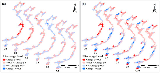 Spatial distribution of ecological resilience change: (a) 1995~2020: C0-1995~2020, C1-1995~2000, C2-2000~2005, C3-2005~2010, C4-2010~2015, C5-2010~2015; (b) 2020~2030: C6-SSP1-2.6, C7-SSP2-4.5, C8-SSP3-7.0, C9-SSP4-3.4, C10-SSP5-8.5.