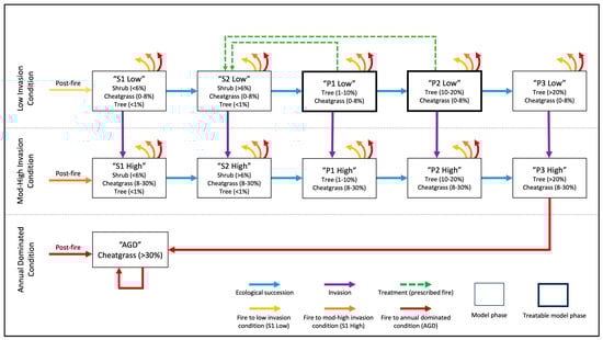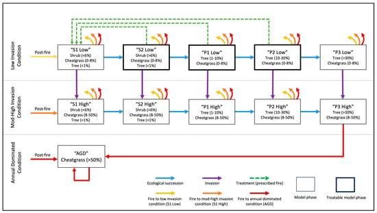 Generalized treatment response model (GTRM) for mountain big sagebrush with the potential for prescribed fire treatment. Boxes represent model phases and describe vegetation composition; shorthand names for the model phases are given in quotation marks. S1 model phases are perennial dominant; S2 model phases are sagebrush dominant; P1, P2, and P3 model phases correspond to Phase I, Phase II, and Phase III woodland. The first row corresponds to a low invasion condition (0–8% absolute annual cover); the second row corresponds to a moderate to high invasion condition (8–50% absolute annual cover); the last row consists of one box corresponding to an annual grass-dominated state (50+% absolute annual cover). Arrows show pathways between different model phases. Blue arrows indicate ecological succession; purple arrows indicate invasion absent wildfire; dashed green arrows indicate treatment. Yellow, orange, and red arrows from boxes indicate that wildfire could transition the system to model phases in the low invasion condition (S1 Low), mod-high invasion condition (S1 High), and the annual grass-dominated condition (AGD). Model phase descriptions were adapted from state and transition models in Chambers et al. []. Model parameters could vary with treatment response groups (TRGs), and the parameters for simulations were determined by analysis as described in Section 2.4.