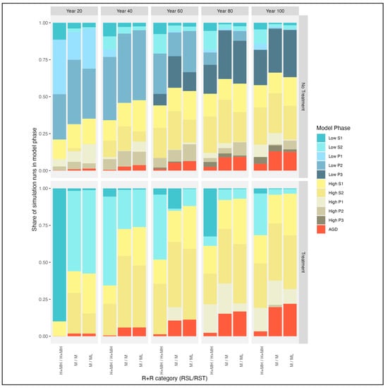 Shares of simulation runs in each model phase after 20, 40, 60, 80, and 100 years in mountain big sagebrush simulations initialized in the low invasion Phase I woodland model phase (P1 Low) without treatment (top panel) and with treatment (bottom panel). Subpanels compare three treatment response groups (TRGs) for mountain big sagebrush at different time cross-sections, where each TRG corresponds to a combination of resilience (RSL) and resistance (RST) indicators. The four levels of the R&R indicators are low (L), moderate-low (ML), moderate (M), and high and moderate-high (H+MH).