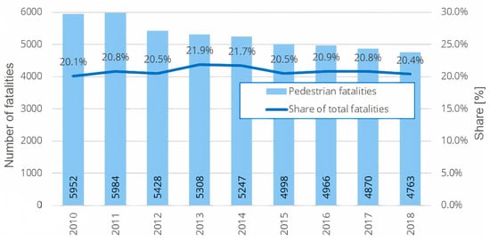 During the last several decades, a number of pedestrian safety measures have been implemented worldwide, largely in developed countries. The European Union (EU) reduced the death rate by 39 percent from 2001 to 2010 and another 20% between 2010 and 2018 partly as a result of national policies, public education, and campaigns to make roads safer [1,2]. Road traffic crashes are caused by a combination of factors involving the road layout, vehicles, road users, and their interactions. Most accidents occur in urban areas, with roughly one in four pedestrian fatalities happening at or near pedestrian crossings. Consequently, about 8000 pedestrians are killed and many more are injured in road accidents in Europe each year. One in five road fatalities in the EU are pedestrians (Figure 1), a higher proportion than other vulnerable road users: 9% for cyclists, 3% for moped riders, and 15% for motorcyclists. Although the absolute number of pedestrian fatalities decreased by 20%, the overall reduction in road fatalities was 21%, maintaining the proportion of pedestrian fatalities within the total number of road fatalities. Within EU countries, the total number of road fatalities and pedestrian mortality are highest in the central and eastern EU Member States and Poland had the highest number of pedestrian fatalities in 2018. That was the case despite the fact that this country had recorded the largest decrease in pedestrian fatalities at that time.