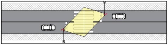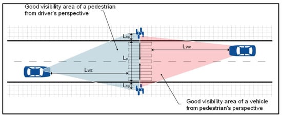 In the area of a pedestrian crossing, adequate visibility conditions must be ensured for pedestrians and oncoming drivers, both during the day and after dark. The area of good visibility is defined by the visibility distance Lwz/Lwp (Figure 4). Hence, the idea of additional lighting is to improve the visibility of pedestrians and pedestrian crossings in nighttime conditions. To meet these conditions a crosswalk with additional lighting system should be equipped with two extra lamps—one above the traffic lane according to the standards/guide issued in 2018 [62]. A Scheme of an exemplary location of the lighting system on a two-way single carriageway is given in Figure 5.
