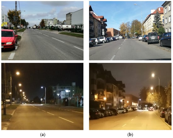 Figure 6. Examples of day and night views of analyzed pedestrian crossing: (a) PC_1 and (b) PC_6.
