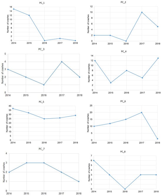 Figure 7. Changes in crash tendencies for the analyzed pedestrian crossings.