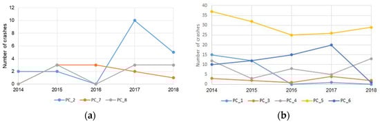 Figure 8. Changes in number of crashes at pedestrian crossings: (a) with a refuge island and speed limit 40 km/h and (b) without a refuge island and speed limit 50 km/h.