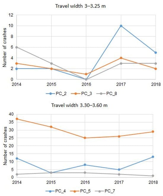 Analyzing the trend of changes in the number of crashes at pedestrian crossings, no clear pattern of changes can be seen. In some cases (PC_1, PC_3, PC_5, and PC_8), a decreasing tendency can be observed in the years prior to the installation of additional lighting, while in others (PC_6 and PC_7), the number of crashes increased. In order to determine possible dependencies of the change in the number of crashes in relation to geometry characteristics, pedestrian crossings were grouped into two categories. Data presenting trends in changes in the number of crashes in relation to the presence of a refuge island are given in Figure 8, while changes in the number of crashes in relation to the width of the travel lane are given in Figure 9.