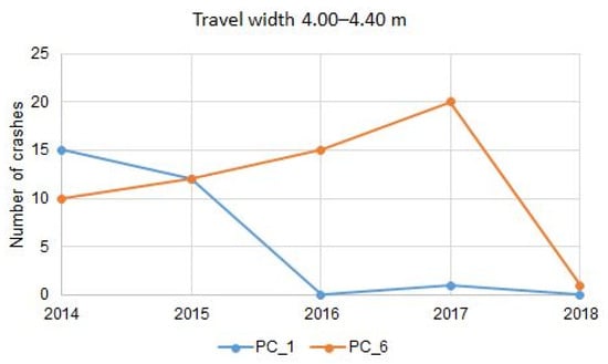 Trends in crash changes observed on the basis of data presented in Figure 9 are quite ambiguous. In the case of pedestrian crossings with the narrowest travel lane, the number of crashes was decreasing before additional lighting was installed. In the following years, the number of crashes first increased and then decreased again obtaining similar values to those registered before 2016. In the case of crosswalks located on streets with a travel lane width of 3.30–3.60 m, there was no clear pattern for the change in number of crashes before a new installation was applied. However, the following years brought a worsening of the situation and adverse effects. An increasing number of crashes can be observed at two out of three pedestrian crossings. In the case of pedestrian crossings situated on streets with the widest travel lanes, a very positive situation is observed at PC_1 where the number of crashes since 2016 was reduced essentially obtaining one and zero crashes in 2017 and 2018, respectively. In the case of pedestrian crossing PC_6, the number of crashes first increased in 2017 and then dropped to none in 2018.