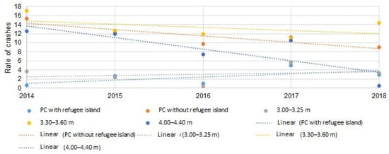Linear trend lines presented in Figure 10 illustrate the changes in crash rates in subsequent years of the period under consideration. In two cases, there was an unfavorable trend indicating an increasing number of crashes recorded at the analyzed pedestrian crossings. In the remaining cases, the trend lines show that the number of crashes decreases over the period under consideration. It should be noted, however, that such a general observation based on trend lines could also be partially misleading. This can be seen in the case of crosswalks on roads with a lane width of 3.30–3.60, where the crash rate in 2018 increased by almost 30% compared to the previous year, while the trend line shows a reverse decreasing trend.