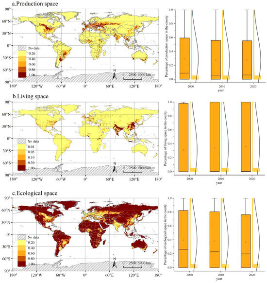 - Fu, J.Y.; Gao, Q.; Jiang, D.; Li, X.; Lin, G. Spatial–temporal distribution of global production-living-ecological space during the period 2000–2020. Sci. Data 2023, 10, 589. [Google Scholar] [CrossRef]