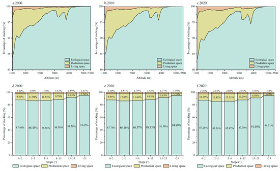 Changes in the proportion of global PLES at different altitudes and slopes in 2000, 2010, and 2020. (a–c) are the stacking percentage of PLES at different altitudes in 2000, 2010, and 2020, respectively. (d–f) are the stacking percentage of PLES at different slopes in 2000, 2010, and 2020, respectively.