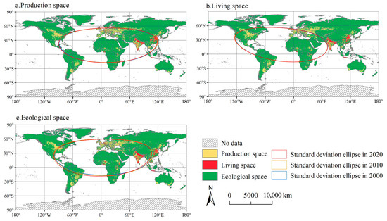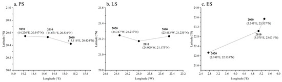 This study plotted the standard deviation ellipse of the global PLES in 2000, 2010, and 2020 to reveal its evolutionary trend (Figure 3 and Figure 4). In general, the global PLES formed an east-west spatial distribution pattern. The standard deviation ellipse of the global PLES increased in the X-axis direction more than in the Y-axis direction, indicating that PLES expanded along the X-axis direction, that is, in the east-west direction. The gravity center of PLES was in the northern hemisphere, with those of PS and ES in the eastern hemisphere and those of LS in the western hemisphere. From 2000 to 2010, the gravity center of the PS shifted 50.803 km to the northwest, and from 2010 to 2020, it shifted 48.318 km to the northwest (Table 2). The PS advanced in a northwest direction during the study period.