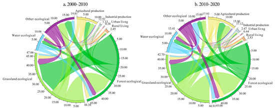 To reveal the transfer characteristics among PLES, a Sankey map was drawn to visualize the transfer matrix during the periods 2000–2010 and 2010–2020 (Figure 5). The conversion between global forest ES and grassland ES from 2000 to 2010 was the most intense, with 25.171 × 106 km2 of forest ES converted to grassland ES. Simultaneously, 16.167 × 106 km2 of grassland ES was transformed into forest ES. In addition, the conversion between other terrestrial spaces and forest ES and grassland ES was relatively strong due to the large area of ES on a global scale. From 2000 to 2010, the amount of agricultural PS converted into LS was much higher than the amount of LS converted to agricultural PS. Specifically, from 2000 to 2010, 21 km2 and 1.424 × 105 km2 of urban and rural LS, respectively, were transformed into PS. In contrast, 206 km2 and 1.384 × 106 km2 of agricultural PS were transformed into urban and rural LS, respectively.