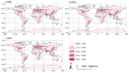 In 2000, 2010, and 2020, the global PSI was 2.199, 2.227, and 2.267; the LSI was 1.544, 1.692, and 1.788; and the ESI was 2.762, 2.650, and 2.546, respectively. In general, we found that the global PSI and LSI demonstrated a slow-increasing trend. ESI, on the contrary, showed a slow decline. In terms of spatial distribution, we can find that the spatial distribution characteristics of PSI, LSI, and ESI were consistent with those of PS, LS, and ES (Figure 6, Figure 7 and Figure 8).