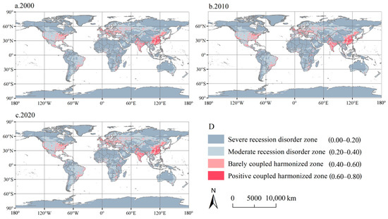 Figure 9 presents the CCD of the global PLES functional index from 2000 to 2020. In 2000, 2010, and 2020, the CCD of the global PLES functional index was 0.186, 0.189, and 0.198, respectively. Spatially, the severe recession disorder zone occupied the leading position at 58.194%, 57.584%, and 55.047% in 2000, 2010, and 2020, respectively. This was followed by moderate recession disorder zones at 19.091%, 19.204%, and 21.016% in 2000, 2010, and 2020, respectively. Barely coupled harmonized zones accounted for 16.061%, 16.392%, and 17.223% in 2000, 2010, and 2020, respectively. The number of positively coupled harmonized zone types was the lowest at 6.654%, 6.819%, and 6.714% in 2000, 2010, and 2020, respectively. There were no high-quality coupled harmonization types. The positively coupled harmonized zone type was primarily distributed in China′s Sichuan Basin and the middle and lower reaches of the Yangtze River plain, as well as in some large cities in India, North America, Europe, and other regions. The poorly coupled harmonized zone was scattered across the area surrounding the positively coupled harmonized zone. These two areas were concentrated in the PS and LS. Generally, the CCD of the PLES functional index was relatively high in these regions. In the surrounding areas, the ES function was superior to the function, which reduced the CCD of the PLES functional index. ES functions dominated the severe recession disorder type.