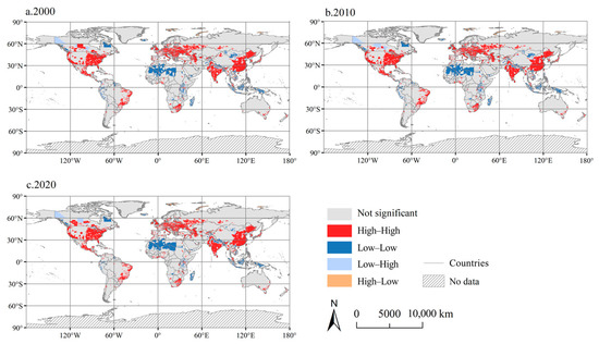 The global spatial autocorrelation indices of the CCD of the global PLES functional index in 2000, 2010, and 2020 were 0.562, 0.567, and 0.569, respectively (Figure 10), with p-values being significant at the 0.001 level and z-values of 526.919, 524.695, and 558.747, respectively. This shows a significant spatial dependency in the CCD of the global PLES functional index. The results of the local spatial autocorrelation showed that the functional CCD of PLES was dominated by H-H, accounting for 19.535%, 19.641%, and 19.738% in 2000, 2010, and 2020. It was primarily located in central and eastern China and parts of Japan in Asia, India, South Asia, and southern Europe, a small amount of southern Africa, the eastern and western coastal areas of the United States in North America, and the eastern region of Brazil in South America. The L-L type areas were mainly scattered across Southeast Asia, northern Africa, and other regions. The other types were relatively rare.