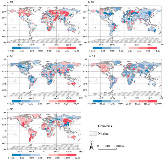 The formation and evolution of the CCD of the global PLES functional index were characterized by complexity and dynamic changes, which were influenced by natural constraints, humanistic driving forces, and human–earth interaction forces. The factors that influence the CCD of the global PLES functional index differ by region. Therefore, scientifically revealing the spatiotemporal differentiation of the natural binding and human driving forces in the evolution of the CCD of the global PLES functional index is vital for studying and determining the development direction and evolution trend of the CCD of the global PLES functional index [45,46].