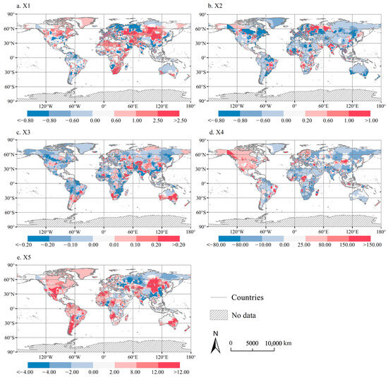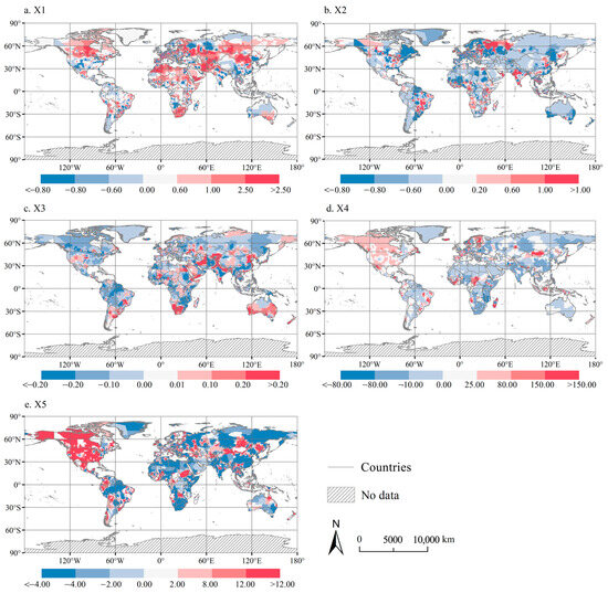 The regression coefficients of the average annual precipitation, altitude, proportion of forest, nighttime light density, and road density are presented in Figure 11, Figure 12 and Figure 13. The influence of the global average annual precipitation on the global CCD of the PLES functional index demonstrated evident spatial heterogeneity. The areas showing negative effects were discrete, but the contributions were significant in northern China and the Tibetan Plateau, India and South Africa. The positive effects of the annual average precipitation on the global CCD of the PLES functional index in 2000 were mainly distributed in Mongolia in Asia, southern Russia, the Sichuan Basin in China, the North China Plain, parts of Inner Mongolia, northeastern Europe, peripheral areas of Africa, northern parts of North America, and southern parts of Australia.