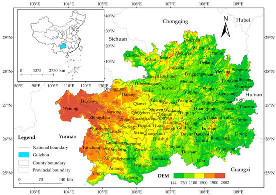 Guizhou Province is situated on the Yunnan-Guizhou Plateau (Figure 2). By the end of 2023, Guizhou Province had 88 districts and counties with a resident population of 38.65 million. As a typical mountain karst area, Guizhou Province is the only province in China without a plain, and its average altitude is 1100 m. Most of Guizhou Province is plateau and mountainous areas. Of this, 92.5% of the area is covered by mountains and hills. As a transport hub in southwest China, Guizhou Province is an important transit area for the northwestern and southwestern provinces and regions to the coast. It is worth noting that the province of Guizhou is one of the few regions that has realized high-speed access to all counties. In addition, Guizhou Province is also known as “eight mountains, one water, one field”, which is a typical karst landscape with serious rocky desertification in some areas [66,67]. The special topography and geomorphology make land resources in Guizhou Province even more scarce.