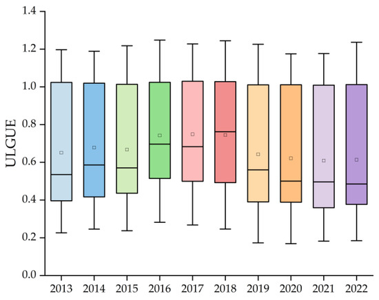 As can be seen in Table 2, the extreme variance increased from 0.97 in 2013 to 1.05 in 2022 during 2013–2022. The standard deviation, while not varying much overall, is still fluctuating and changing. This shows that, as cities continue to develop, the gap in the ULGUE between cities shows a tendency to widen. However, this widening of the difference is not obvious when judged only from the extreme values and standard deviations.