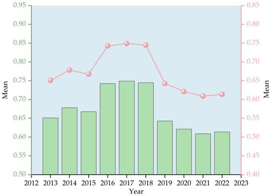 As can be seen from Figure 4, the average curve of the ULGUE in Guizhou Province as a whole shows an ‘inverted U’ shape, i.e., the average value of the ULGUE value demonstrated the development trend of slowly increasing–stable development–slowly decreasing. Therefore, the whole can be divided into the following three phases: (1) A slow improvement phase (2013–2016), in which the average value of the ULGUE increased from 0.6510 to 0.7426. The green transformation presented a good development situation of steady progress and steady improvement. (2) A phase of stable development (2017–2018), with the average value of efficiency remaining around 0.74. At this stage, the province earnestly implemented the spirit of the 19th National Congress of the CPC and the important speech of General Secretary Xi Jinping at the Guizhou delegation, which insisted on guarding two bottom lines, that is, a special emphasis on development and ecology, and continued to improve the ecological environment. (3) A downward trend phase (2019–2022), where the average efficiency value decreased from 0.7446 to 0.6136. Desired outputs such as economic and social benefits increased during this period. This suggests that the inefficient use of urban land resulted from the continued expansion of building land. It also increased the environmental pressures to some extent.