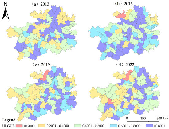 Distribution of the ULGUE in Guizhou Province counties during 2013–2022.