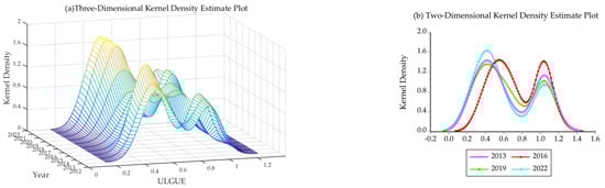 This section describes the time-series evolutionary characteristics of the ULGUE in counties within Guizhou Province from a global perspective. In this study, we will plot data from four selected years in kernel density plots to specifically characterize the evolution of the ULGUE in Guizhou from a time-series perspective for detailed analysis (Figure 6).