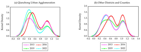 The results indicate the following: (1) In terms of the shifts in the curve position, the Qianzhong Urban Agglomeration and the other districts and counties are shifted to the right from 2013 to 2016, and, in the next shift in the curve position, they were moved to the left from 2017 to 2022. This indicates that the ULGUE in the Qianzhong Urban Agglomeration and other districts and counties in the study period shows a tendency to increase and then to decrease, among which the kernel density curve of Qianzhong Urban Agglomeration has a larger leftward shift, which indicates that the value of its efficiency had a larger change. (2) Regarding the shape change, the right side of the kernel density curve of the Qianzhong Urban Agglomeration had a slightly longer trailing tail than the left side, while the left side of the other districts and counties had a longer trailing tail. This shows that, quantitatively, cities with high efficiency values are slightly more than cities with low efficiency values in the Qianzhong Urban Agglomeration, while other districts and counties have a higher number of cities with low efficiency values. (3) From the number of waves, the Qianzhong City Cluster and other districts and counties had obvious double-peak coexistence phenomena during the study period, and there were obvious polarization characteristics in the efficiency among cities. (4) Regarding the height of the main peak, the height of the main peak of the Qianzhong Urban Agglomeration increased sharply in 2013–2016, leveled off in 2017–2019, and rose again in 2020–2022, while the other districts and counties continued to decline in the peak kurtosis of the main peak in 2013–2019, and showed an upward trend in 2020–2022. This indicates that the difference in the ULGUE among cities in the Qianzhong City Cluster is decreasing year by year, while the difference in the ULGUE among cities in other districts and counties shows an evolutionary characteristic of expanding first and then decreasing.
