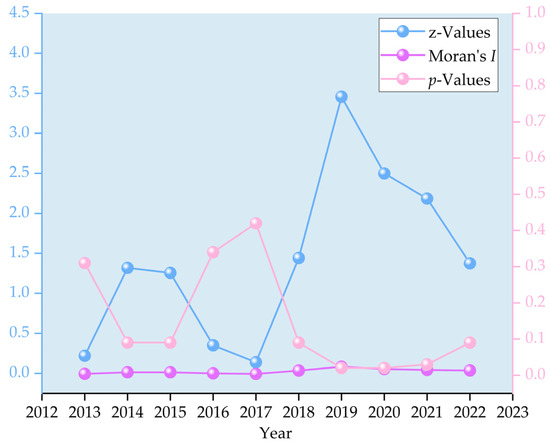 Change in the global Moran’s of the ULGUE in Guizhou Province counties during 2013–2022.
