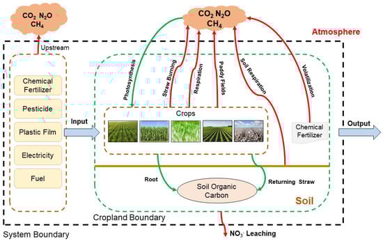 System boundary, GHG emissions, and carbon sequestration in a cropland ecosystem. Red arrows represent GHG emissions and green arrows represent carbon sequestration.