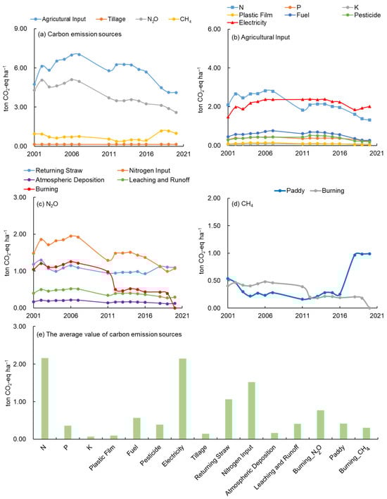 Variations of carbon emission sources (a), agricultural input (b), N2O emissions (c), and CH4 emissions (d) in the whole Yellow River Delta region during 2001–2020. (e) The average values of carbon emission sources during 2001–2020.