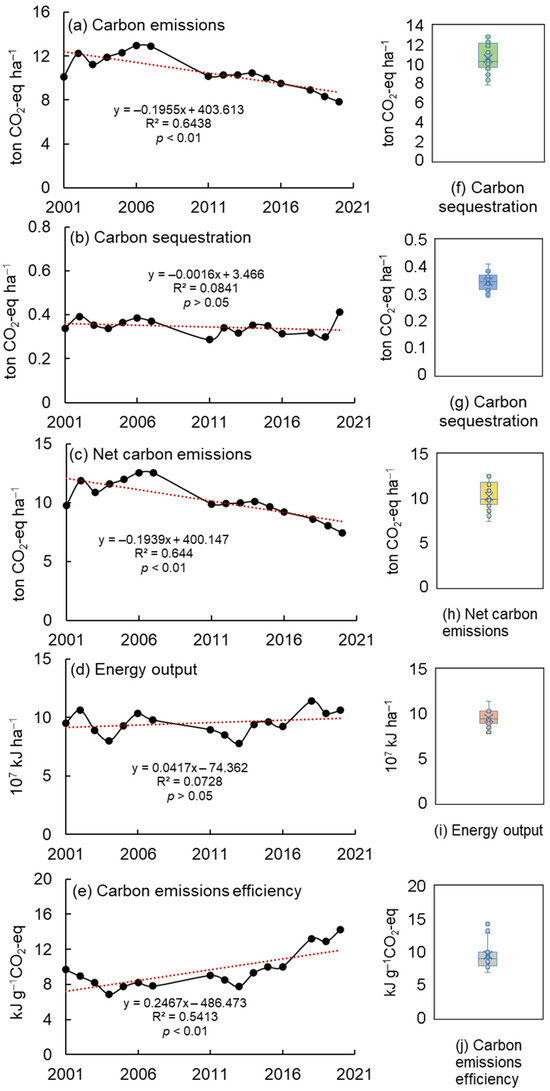Variations and boxplots of carbon emissions (a,f), carbon sequestration (b,g), net carbon emissions (c,h), energy output (d,i), and carbon emission efficiency (e,j) for the whole Yellow River Delta region.