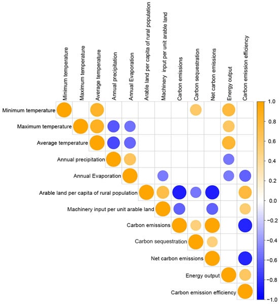 Carbon emission indices (carbon emission, carbon sequestration, energy output, net carbon emissions, carbon emission efficiency), cropland management scale (arable land per capita of rural population), agricultural mechanization (machinery input per unit arable land), and climate factors (minimum temperature, maximum temperature, average temperature, annual precipitation, and annual evaporation) are all represented graphically in a correlation matrix using the Spearman correlation coefficient. Positive correlations are shown by orange, whereas negative correlations are shown by blue. The size of the circles and the color intensity show how strongly the relationships exist. Non-significant correlations (p > 0.05) are indicated by empty cells.