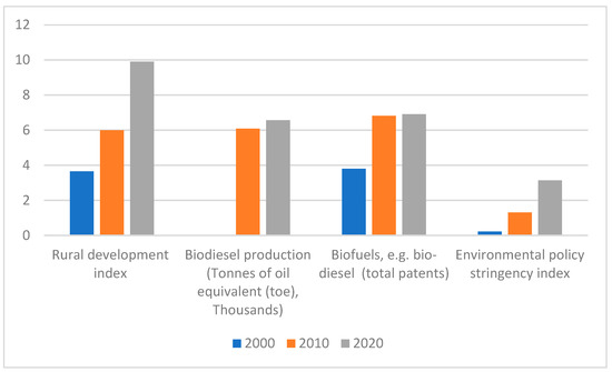 Using an entire secondary time-series Chinese dataset at the aggregate level, this study investigates the impact of bioenergy and environmental policy stringency on sustainable rural development from 1995 to 2022. Rural development (RD) is quantified through the rural development index. This index is calculated by the authors. The indices used to compute the rural development index in the study are obtained from aggregate-level data. The data represent the entire rural population of China. The RD index is constructed using five variables; (1) the rural individuals using the internet (% of population); (2) average annual income in rural areas (in Yuan); (3) the average years of total schooling in rural areas; (4) access to clean fuels and technologies for cooking in rural areas (% of rural population); and (5) adaptation technologies in agriculture, forestry, livestock or agro-alimentary production (total patents). This index is generated via principal component analysis. The data for rural internet users are sourced from the CNNIC [55]. The data on average annual income in rural areas are derived from Statista. The data on the average years of schooling in rural areas are collected from CHNS [56] and CFPS [57]. The data on access to clean cooking fuels and technologies comes from the World Bank [58]. Finally, the data on adaptation technologies in rural agriculture is provided by the OECD [59].