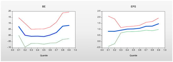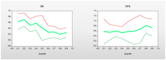 Short-run estimates of BE and EPS. Note: The solid line indicates estimated parameters across quantiles, while the outer lines show confidence intervals.