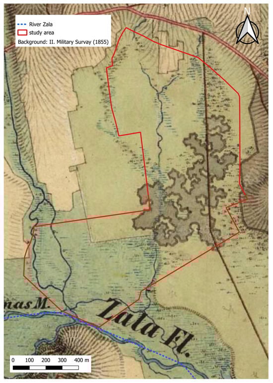 Before the regulation of the river Zala (until the 18th century), the river flowed through swamps, marshes, and fens, sometimes forming small islands with several branches, sometimes without a clear channel [36,51]. The wetlands were so large that in 1596, the local people hid here from foreign soldiers when they were attacked [53]. These wetlands were along the river and were covered with reeds, sedges, alders, and ashes. The river Zala flooded its floodplain several times a year. Peat soil was common along the river. This peat soil was all formed in fens. At that time, several types of fens were still found in the valley. Part of this landscape was our study area, which was also a wetland with fens, swamps, and reedy areas with patchy woody vegetation (1784) [36,52]. In the mid-19th century, the northern part of the study area is depicted as treed, shrubby, wet meadow. On the map of the second military survey (1855) [37], the meadows along the river are marked in a different colour than the northern part of the study area (Figure 3). This is an important difference as the first botanical reports and the present surveys indicate that the northern areas were fens, while the southern areas were wet meadows [34,59]. Fen meadows are only preserved here, while today only wet meadows are found along the Zala.