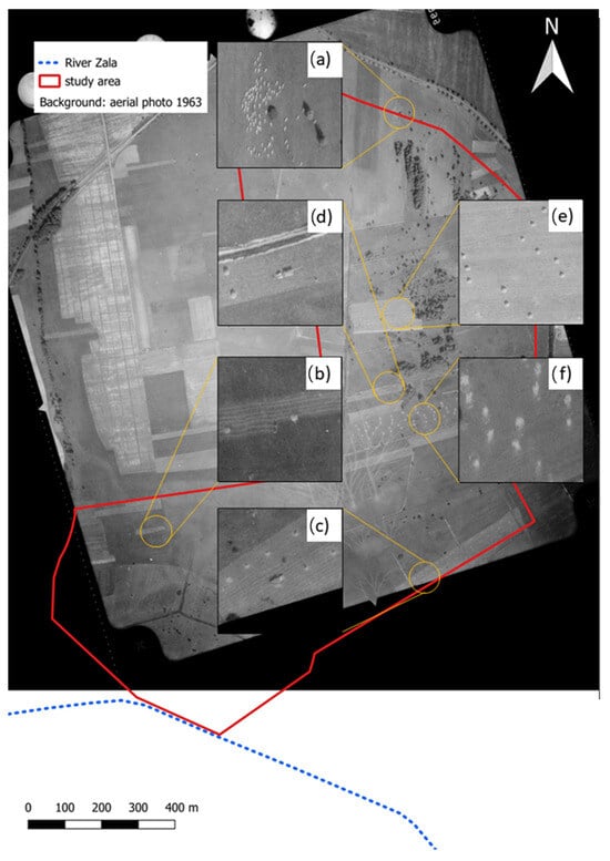 The first available high-resolution aerial photograph of our study area was taken on 16 September 1963 from an altitude of 1850 m. The 16,316 × 17,719 pixel image was enlarged to determine the relevant details [33]. The different stages of grazing, scything, haymaking, and hay transport can be seen in the area. At the time of the aerial photograph, the following six activities can be observed simultaneously: (a) cattle grazing; (b) scything; (c) loading hay onto carts; (d) transporting hay by ox cart; (e) haycocks and hayracks; and (f) scythed area without hayracks (already brought in) (Figure 4 and Figure 5) Even then, the northern part was a wetter area than the southern part. Only at the end of the summer in dry weather when the heat had dried up the water could scything be performed, mostly for bedding, because there was a lot of sedge. If there was no rain, only then could they go on with the ox cart. If it was a rainy summer, the locals could not even scythe the fen meadow [Ódor ex verbis].