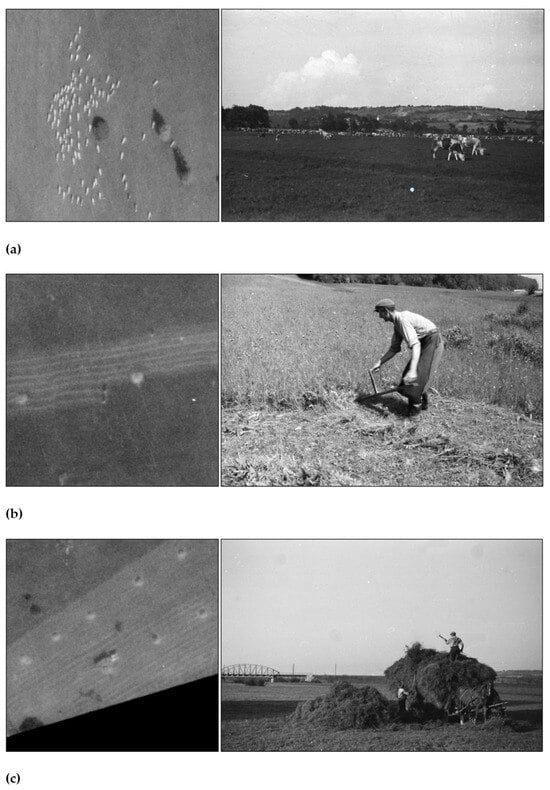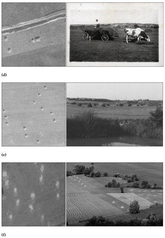 The figure shows an illustration of the details extracted from Figure 4. In all cases, the image on the left is from the 1963 aerial photograph [33]. The right side of the image pair shows the same activity, illustrated with contemporary photographs from the same region on similar habitats. (a) [63] cattle grazing; (b) [64] scything; (c) [65] loading hay onto carts; (d) [66] transporting hay by ox cart; (e) [67] haycocks and hayracks; and (f) [68] scythed area without hayracks (already brought in).