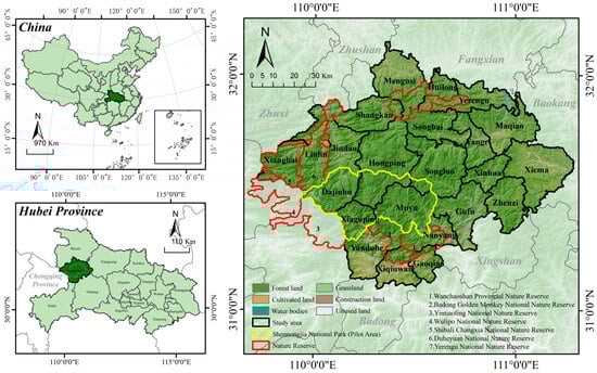 In this study, we referred to the ecological geographical boundaries of the Qinling-Daba Mountain mixed forest ecological region, aiming to systematically and comprehensively assess SNP and surrounding areas with similar ecosystem types and ecological processes. Considering the accessibility of data for subsequent research, the Hubei portion of the Qinling-Daba Mountain mixed forest ecological region was finally selected as the study area (31°05′–32°08′ N, 109°42′–111°17′ E), encompassing 23 townships, including Dajiuhu, Xiaguping, and Yanduhe, covering a total area of approximately 8969 km2. This area includes SNP, four national nature reserves (Badong Golden monkey, Shibali Changxia, Duheyuan, and Yerengu), and Wanchaoshan Provincial Nature Reserve (Figure 1).