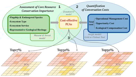 This study mainly includes the following three steps (Figure 2). Firstly, the conservation importance of the core resources of SNP was comprehensively assessed from three levels: species, ecosystems, and geological heritage. Next, the types of conservation costs in SNP were identified, and their spatial distribution was quantified using statistical and land use data. Finally, Zonation 5 software was used to identify cost-effective PCAs, with the top 17%, top 30%, and top 50% regions designated as potential PCAs in SNP.